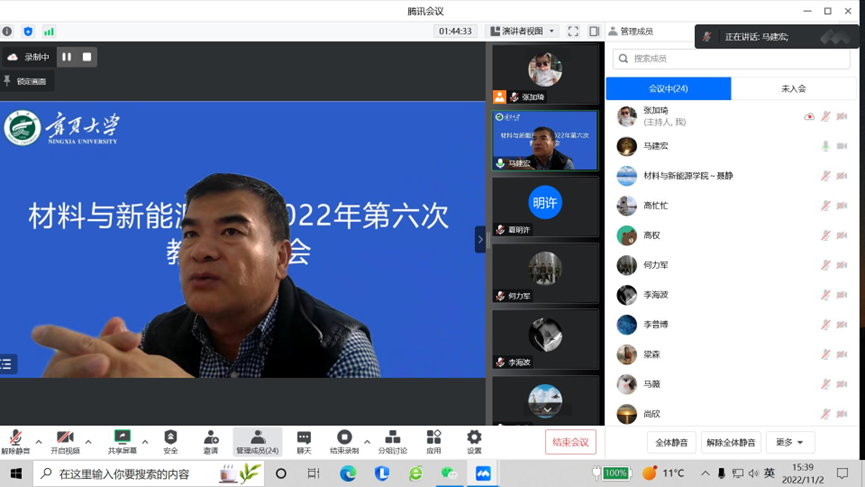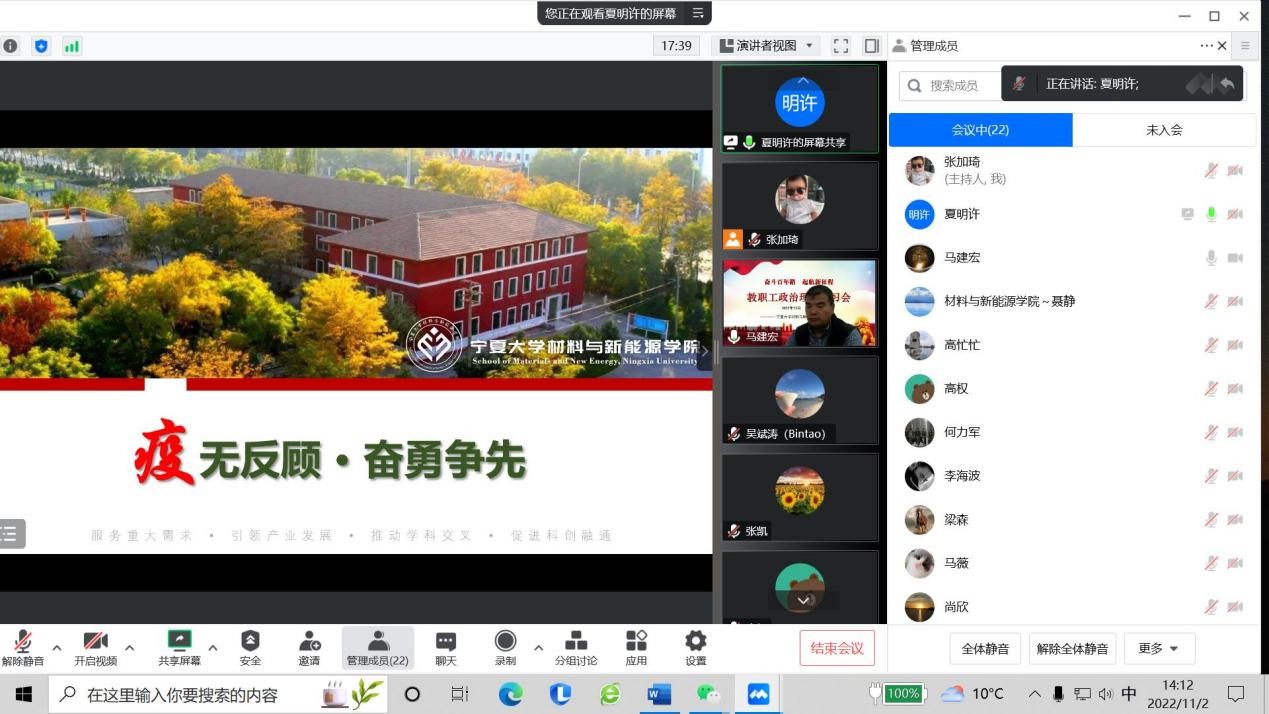 2022年11月2日下午,学院通过线上会议形式召开了2022年第六次教职工大会。直属党支部书记马建宏主持会议,学院全体教职工参会。