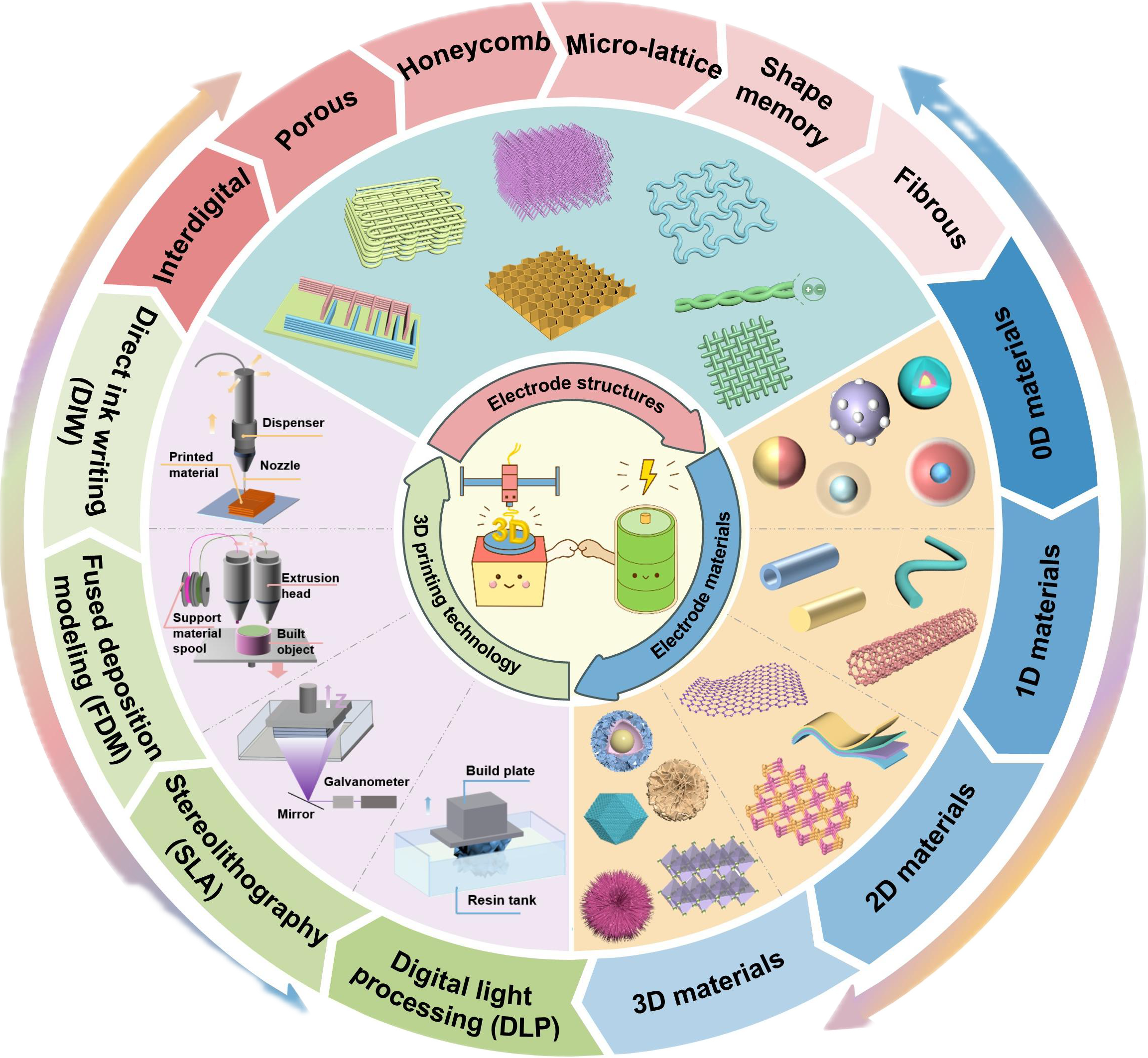 文章综述了电化学储能3D打印技术代表性电极结构和材料的最新研究进展,主要内容有:主流3D打印技术,以及相应的油墨特性;包括叉指结构、多孔结构、蜂窝结构、微晶格结构、形状记忆结构和纤维结构等在内的3D打印电极结构;各种3D打印电池材料在零维直到三维各个维度上的性能特点及其在电化学储能中的应用等。