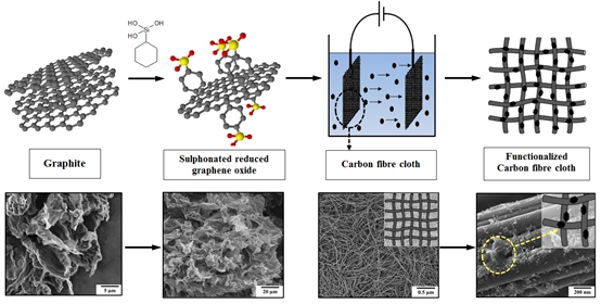 功能化石墨烯碳纤维复合电极的制备过程和电子显微照片