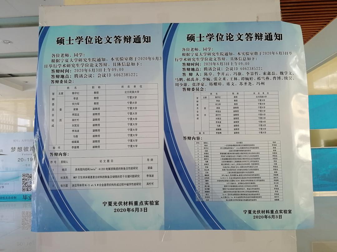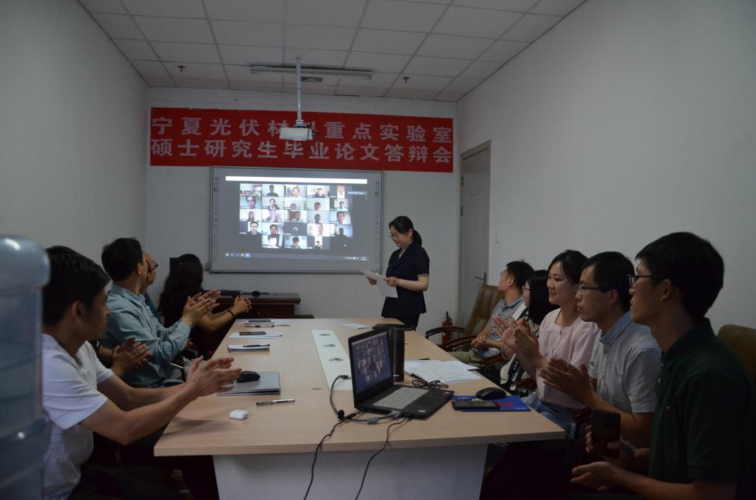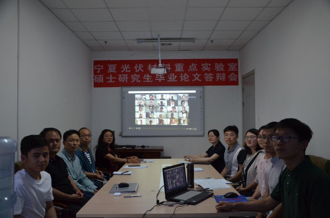 进入新冠疫情防控常态化阶段以来,宁夏光伏材料重点实验室严格遵守和落实学校有关文件会议精神和要求,一方面做好疫情防控工作,一方面有序推进教学科研工作的开展。2020年6月3日,2020届首次硕士研究生学位论文答辩工作在网上进行,分散在全国十几个省区共24名同学参加了答辩。答辩委员会成员参会地点在九游娱乐