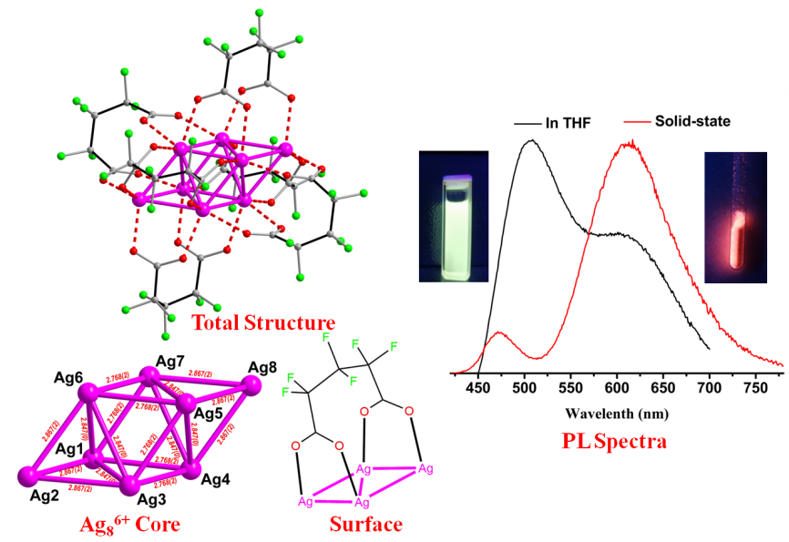 刘宽冠副教授本次发表的成果是关于原子结构精确的银纳米团簇的结构和性能。尺寸介于一般配合物分子和金属纳米粒子(~3 nm)之间的原子结构精确的单层配体保护的币金属纳米团簇,由于具有确定的原子组成和明确的几何结构,在实验上可以像配合物分子一样进行精确表征;它们还可看成是纳米粒子形成的初始状态,在性能上保持了纳米粒子诸多优点,近年来受到了各国研究者的广泛关注。构筑新型币金属纳米团簇并在原子水平上揭示团簇特殊性质的结构基础,对于理解团簇结构与性能的相关关系问题具有重要的科学意义。论文中,刘宽冠副教授与美国加利福尼亚大学河滨分校江德恩教授、温州大学胡茂林教授合作报道了首例全羧酸保护的银纳米团簇[Ag8(pfda)6]6-(pfda = hexafluoroglutaric acid,六氟戊二酸),通过X-射线单晶衍射分析揭示其金属核心为Ag86+菱方体,其表面被六个六氟戊二酸根通过cis-μ4-η1,η1,η1,η1的配位模式保护。对该结构的发光性能研究表明:相较于无机含氧型保护配体构筑的币金属纳米团簇,有机羧酸保护的银纳米团簇具有更好的荧光性能(室温荧光,高量子产率和荧光寿命),是一类具有潜在应用价值的荧光材料;TDDFT计算结果显示,该纳米团簇分子在378 nm处的吸收与其HOMO分子轨道到LUMO分子轨道的跃迁相关,在263 nm处的吸收主要与其HOMO分子轨道到LUMO+1分子轨道的跃迁有关;对其分子发光性能研究显示,其固态常温发明亮的橙黄色荧光,THF溶液常温发明亮的黄绿色荧光,其固态荧光量子产率为39.1 %,荧光寿命为0.191 ms。本项研究发展了一条制备新型银纳米团簇的简单方法,为发现更多新型有机羧酸保护的币金属纳米团簇开辟了道路。