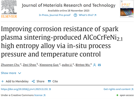 吴斌涛教授课题组在高熵合金研究中取得新进展。团队提出一种简单的方法原位控制AlCoCrFeNi2.1共晶高熵合金FCC与BCC相变含量,从而有效提升了合金的腐蚀性能。相关成果以“Improving corrosion resistance of spark plasma sintering-produced AlCoCrFeNi2.1high entropy alloy via in-situ process pressure and temperature control”为题发表在国际知名期刊《Journal of Materials Research and Technology》(中科院一区TOP),九游娱乐