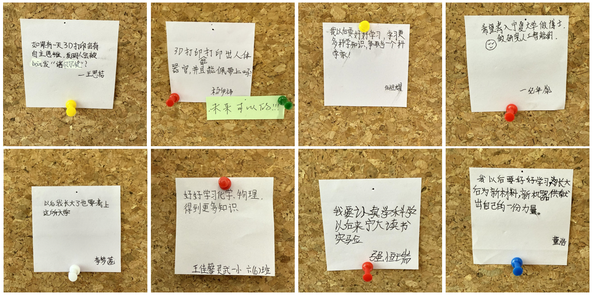 ”“我以后要好好学习,学习更多的科学知识,争取当一个科学家”“我要来这里当教授”“我要好好学习为新材料贡献出自己的力量”……稚嫩的笔触下,流露出孩子们对外来的无限期许。