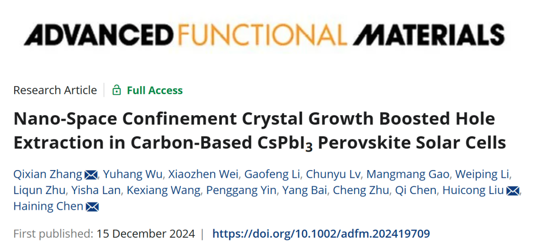 近日,学院光伏组件回收及高值利用团队青年教师张啟先在全无机碳基钙钛矿太阳能电池研究中取得重要进展,相关工作以“Nano-Space Confinement Crystal Growth Boosted Hole Extraction in Carbon-Based CsPbI3Perovskite Solar Cells”为题发表在材料科学领域国际权威期刊《Advanced Functional Materials》(Q1/IF 18.5),九游娱乐