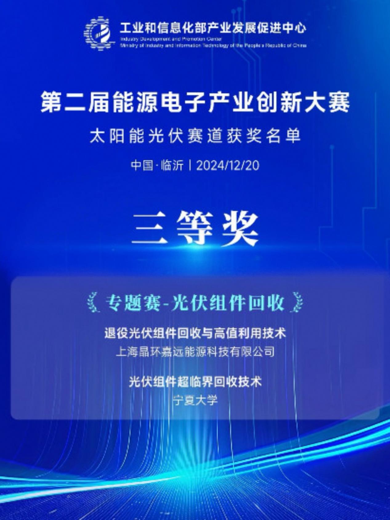 近日,第二届能源电子产业创新大赛圆满落下帷幕。九游娱乐光伏组件绿色回收及低碳发展团队在第二届能源电子产业创新大赛太阳能光伏赛道比赛中荣获三等奖。学院对此表示祝贺!