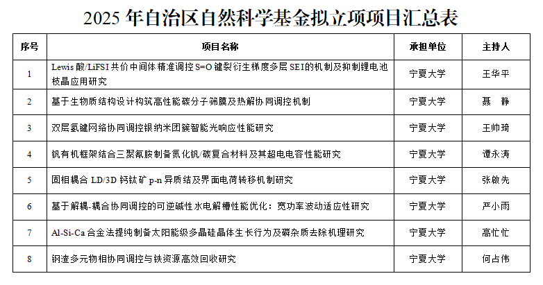 近日,宁夏回族自治区科学技术厅公示了2025年度自治区自然科学基金项目评审结果,九游娱乐成功获批8项,在此,向立项的各位教师表示祝贺!