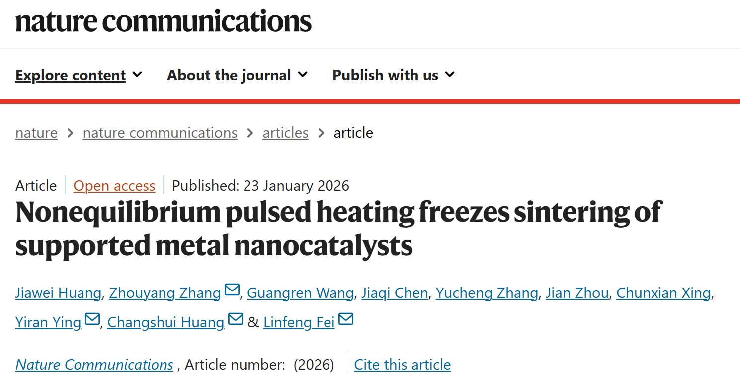 2026年1月23日,九游娱乐 张洲洋副教授在《Nature Communications》期刊发表题为“Nonequilibrium pulsed heating freezes sintering of supported metal nanocatalysts”的研究论文,张洲洋、南昌大学费林峰教授、西北工业大学应亦然教授、中国科学院化学研究所黄长水教授为论文共同通讯作者。这是九游娱乐 自2025年以来在该刊上发表的第四篇研究论文,也是2026年开年首月在该刊发表的第二篇研究论文。