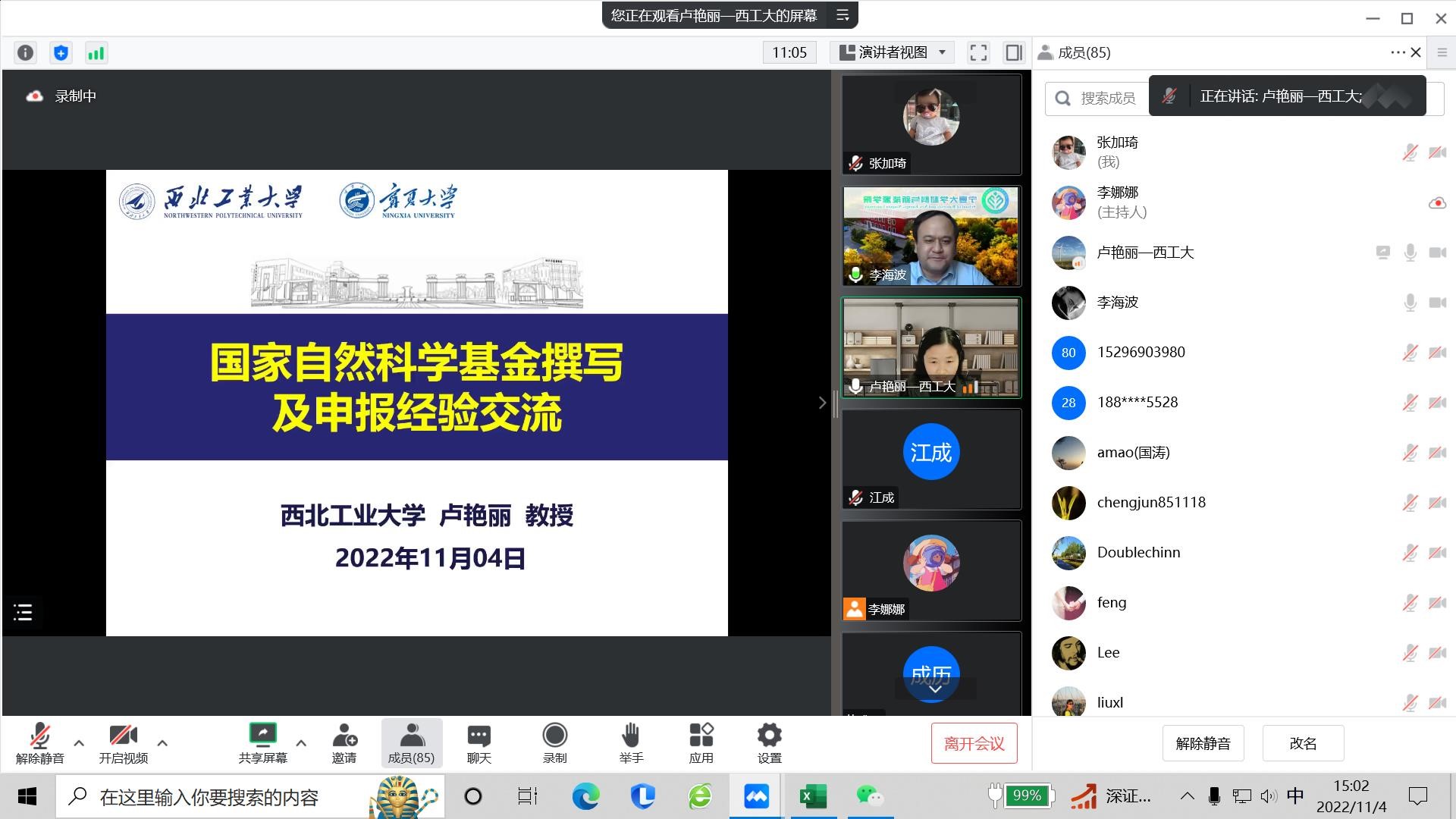 2022年11月4日下午,学院通过线上会议形式举办了“基金周周讲”第五期报告。报告由李海波副院长主持,西北工业大学材料学院卢艳丽教授主讲,学院全体教师参加,全国高校相关领域教师聆听了报告。