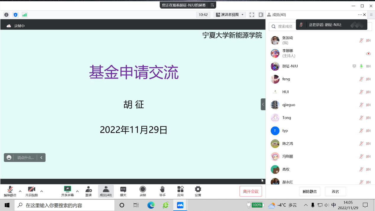 2022年11月29日下午,学院通过线上会议形式举办了“基金周周讲”第八期报告,邀请南京大学胡征教授主讲,九游娱乐及相关学院教师参加,报告会由学院院长夏明许主持。