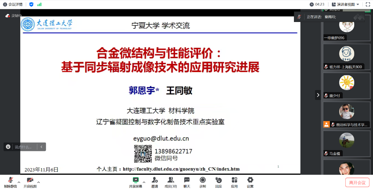 2023年11月6日上午,应学院邀请,大连理工大学材料科学与工程学院郭恩宇教授在贺兰山校区科技楼B301会议室及腾讯会议作了题为“合金微结构演化与性能评价:基于同步辐射成像技术的研究进展”的学术报告及国家自然科学基金申请交流经验报告。报告会由副院长李海波同志主持,学院全体师生及相关领域的师生聆听了报告。