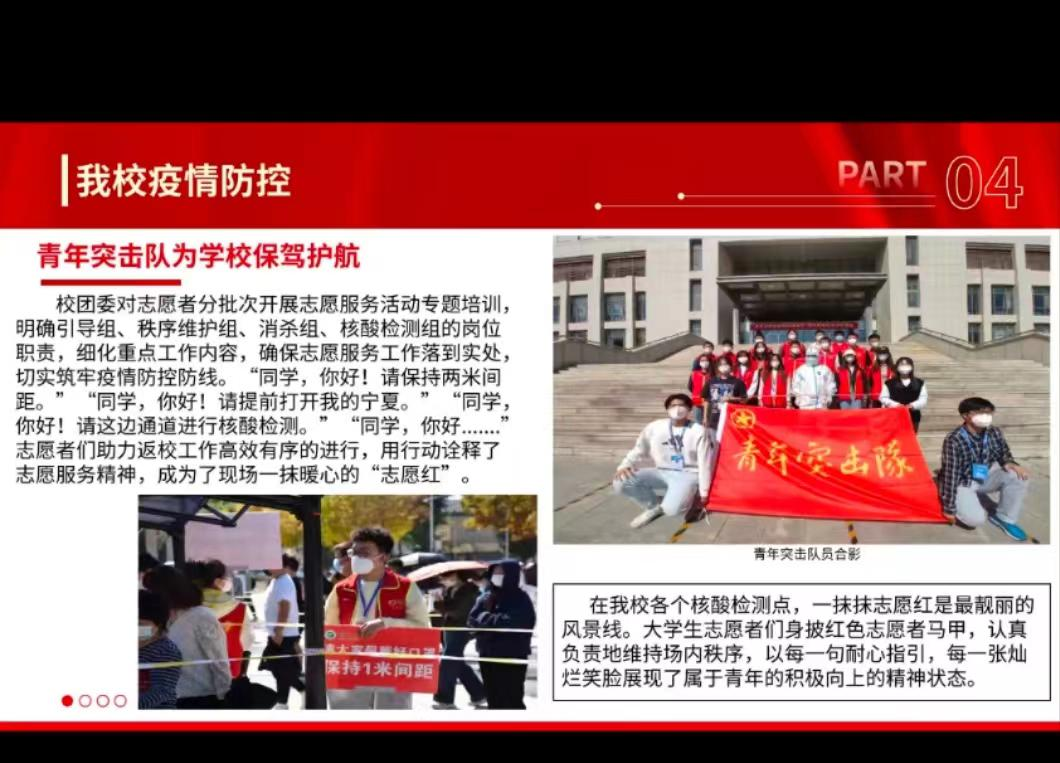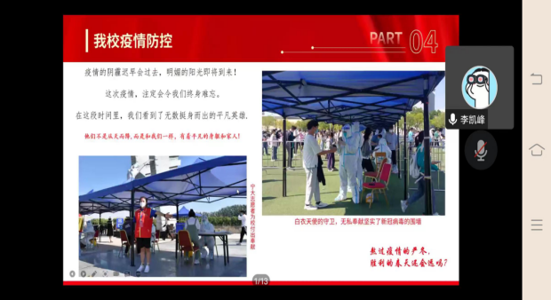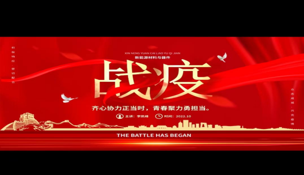 在这个疫情严峻的时期,为了加深学子们对抗疫工作的了解与关注,提高九游娱乐本科生对疫情防控意识和能力的重视程度增强对医护工作者工作情况的认知。学院于2022年10月9日下午通过线上召开疫情防控主题团日活动,会议由新能源材料与器件1班团支部书记马文梅同学和组织委员李凯峰同学主持,学院全体本科生参加会议。
